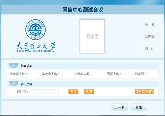 参会人员把校园玉兰卡放入读卡器卡槽内(图1红框),听到滴的一声提示音,即可显示如图2所示的参会人员信息包括证件号(职工号或者学号)、部门、照片、出席情况等。若未带卡,可在“手工签到栏”输入证件号进行手工签到。