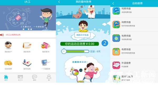“i大工”微信公众号设有“我的教务”“我的图书”功能,非常实用哦。看课表、查成绩更是小菜一碟,还有图书借阅情况及欠费情况也一目了然,省去了好多重复登录的麻烦,都是直接与你的账号关联即可。