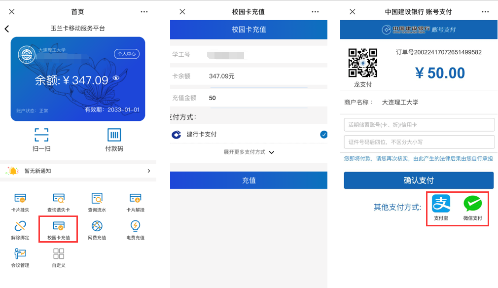 新系统的玉兰卡线上充值金额将直接记入卡片,不再需要写卡过程。在充值方式上,学校与中国建设银行大连市分行进行深度合作,成为大连市首个接入聚合支付进行校园卡充值的高校。在原有充值渠道的基础上,用户还可以通过移动端选择银行卡、微信或支付宝进行线上充值。目前,由于微信和支付宝的技术限制,在微信端进入玉兰卡公众号,可选择微信渠道直接进行充值,选择支付宝充值需要进行扫码充值;在“i大工”APP客户端中微信和支付宝都需要扫码充值。近期,我们也将与相关充值渠道单位沟通,进一步优化充值方式。