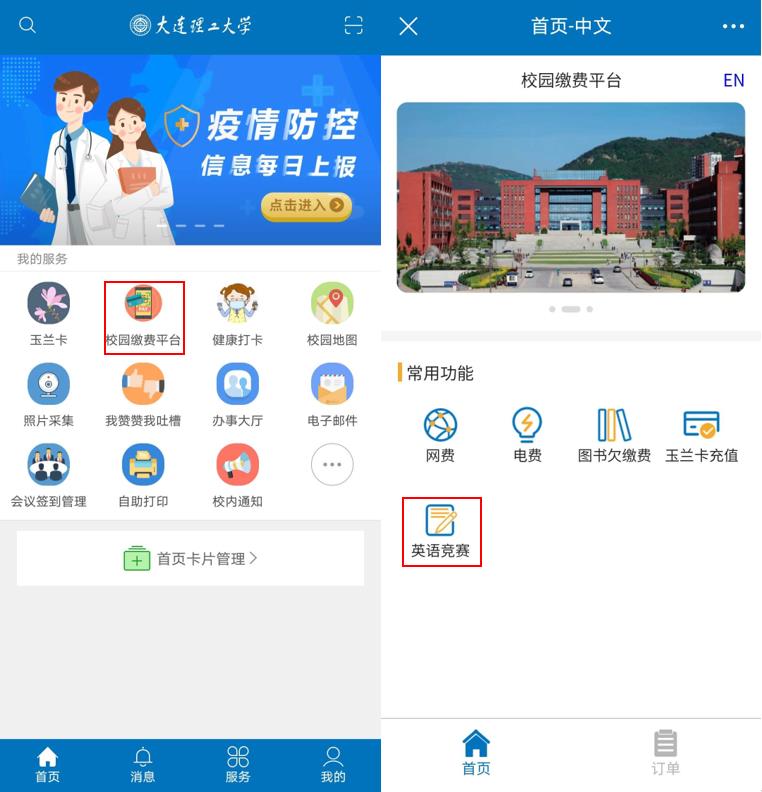 进入“i大工”首页,选择“校园缴费平台”服务,选择“英语竞赛”,根据提示填写相关信息。缴费成功后会弹出提示对话框,在“订单”栏目中可查询缴费记录,有缴费记录表示报名缴费成功。