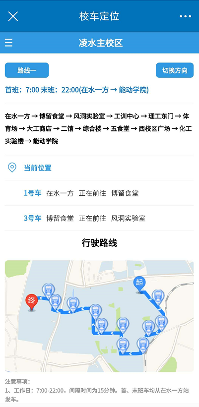2、 打开“校车定位”后可以看到校车的线路站点情况,通过点击“切换方向”按钮可以看反方向线路情况;通过“当前位置”可以看到车次运行当前方向的最近位置,点击地图或“当前位置”按钮可以看到校车运行情况。
