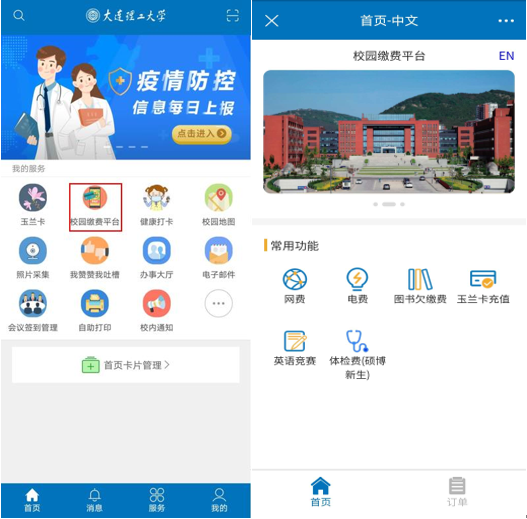 进入“i大工”首页,选择“校园缴费平台”服务,选择“体检费(硕博新生)”,根据提示填写相关信息。缴费成功后会弹出提示对话框,在“订单”栏目中可查询缴费记录,有缴费记录表示报名缴费成功。