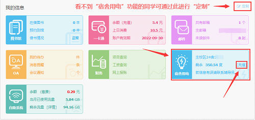 1.已手工定制过“我的信息”版块的学生,需通过手工定制把“宿舍用电”模块加入到“我的信息”中。