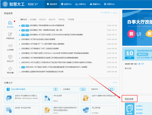 在校园门户首页“我的信息”版块中可查看到“宿舍用电”模块。
