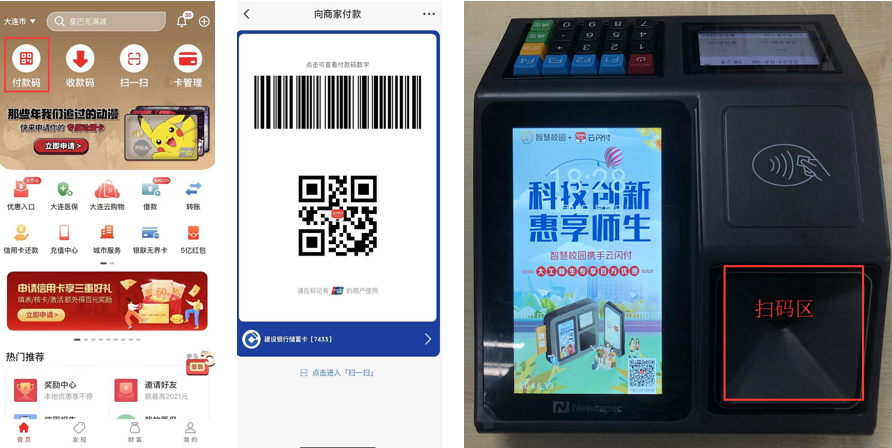 线下食堂消费:在食堂消费POS机,通过“云闪付”APP的付款码进行支付。