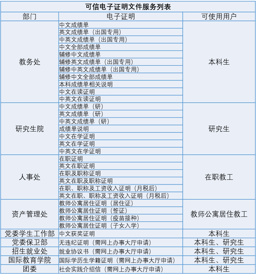 可信电子成绩单和证明文件,是具有电子签章的PDF版文件,可以通过邮件服务器快速发送给国内外各高校或用人单位。可信电子成绩单和证明文件可以通过学信网在线验证(https://www.chsi.com.cn/cjdyz/index)。目前已经实现了教务处、研究生院、人事处、资产管理处、党委学生工作部、党委保卫部、招生就业处、国际教育学院、团委等部门33项业务全自助式在线办理,服务访问方式: