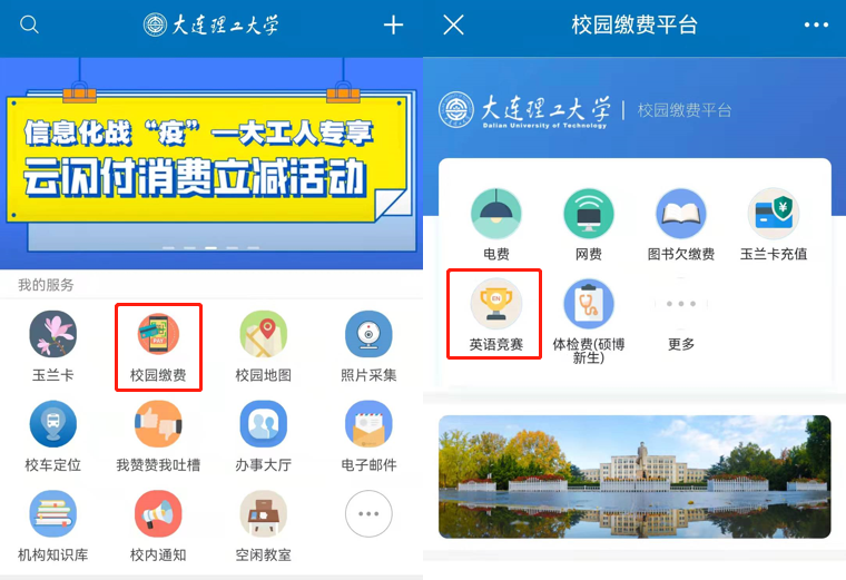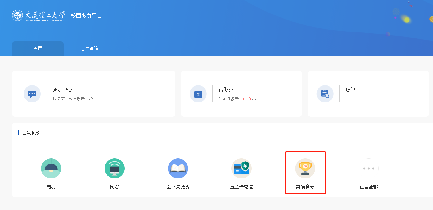 进入“i大工”首页,选择“校园缴费”服务,选择“英语竞赛”,根据提示填写相关信息。缴费成功后会弹出提示对话框,在“订单”栏目中可查询缴费记录,有缴费记录表示报名缴费成功。