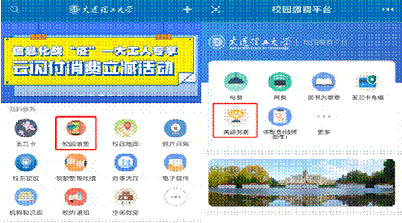 进入“i大工”首页,选择“校园缴费”服务,选择“英语竞赛”,根据提示填写相关信息。缴费成功后会弹出提示对话框,在“订单”栏目中可查询缴费记录,有缴费记录表示报名缴费成功。