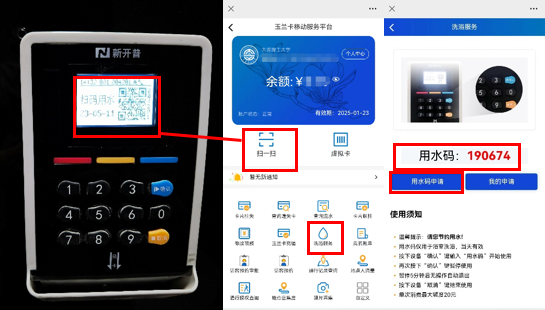 进入玉兰卡移动服务平台-选择“洗浴服务”-点击“用水码申请”,在洗浴水控器输入“用水码”根据提示进行消费。