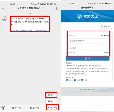 方式一:在微信中搜索并关注 “大连理工大学网信中心” 微信公众号,点击 “个人中心”选择“绑定”,并根据收到的短信中校内临时卡账号信息进行绑定, 一分钟后生效,生效后选择“服务中心”中“玉兰卡”服务,进入玉兰卡移动服务平台即可使用玉兰卡相关功能。