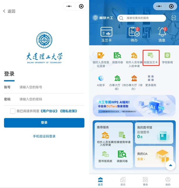 方式二:在微信中搜索“i大工”小程序,首次进入根据收到的短信中校内临时卡账号信息进行绑定,登录后选择“事务”中“校园玉兰卡”服务,进入玉兰卡移动服务平台即可使用玉兰卡相关功能。